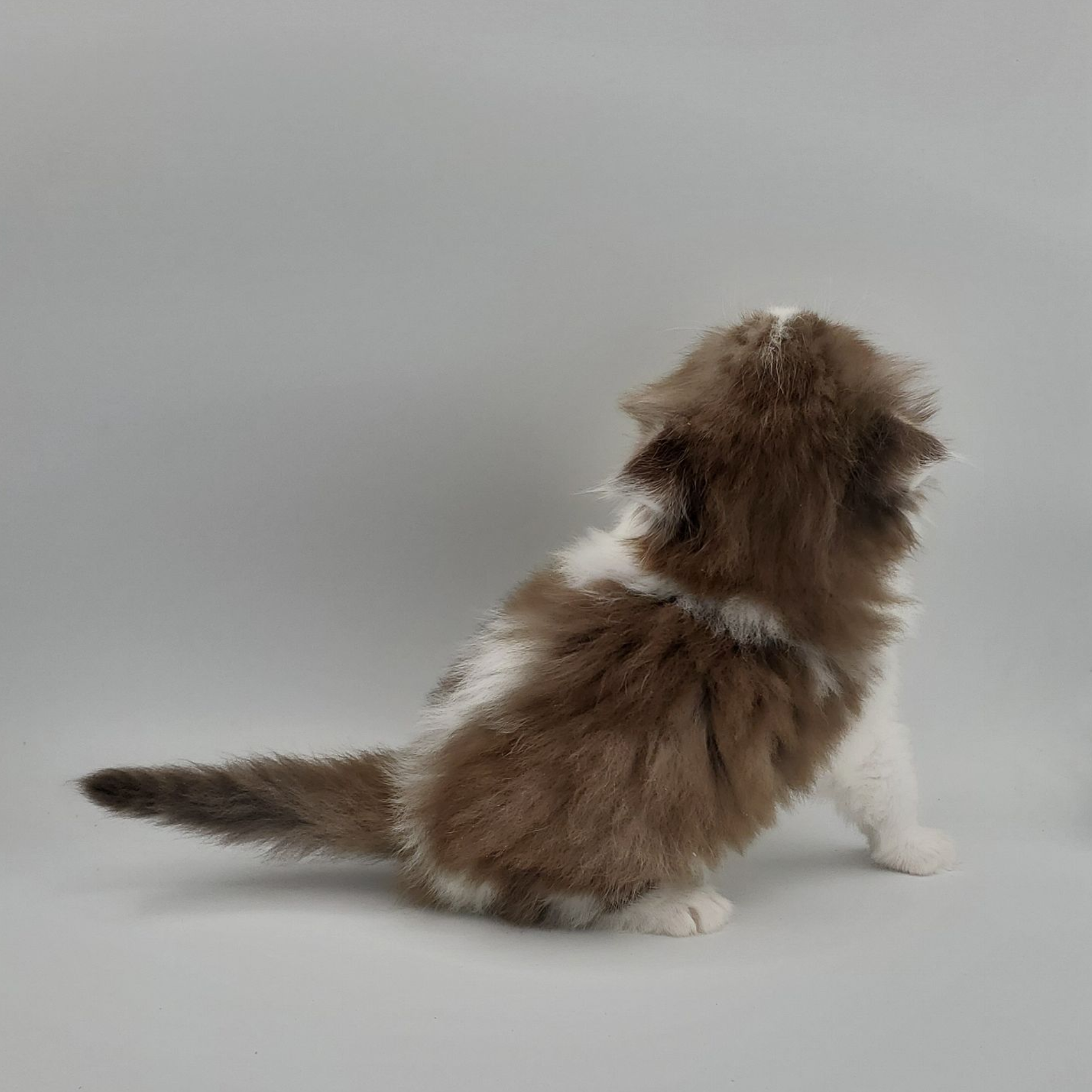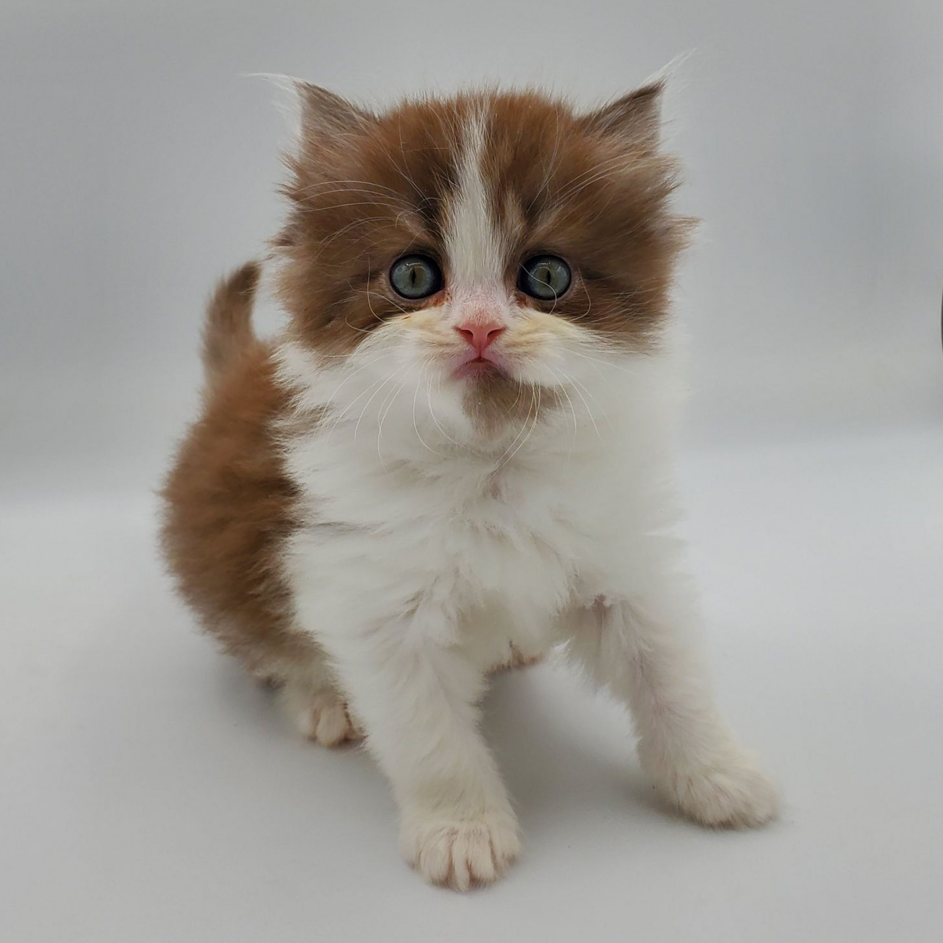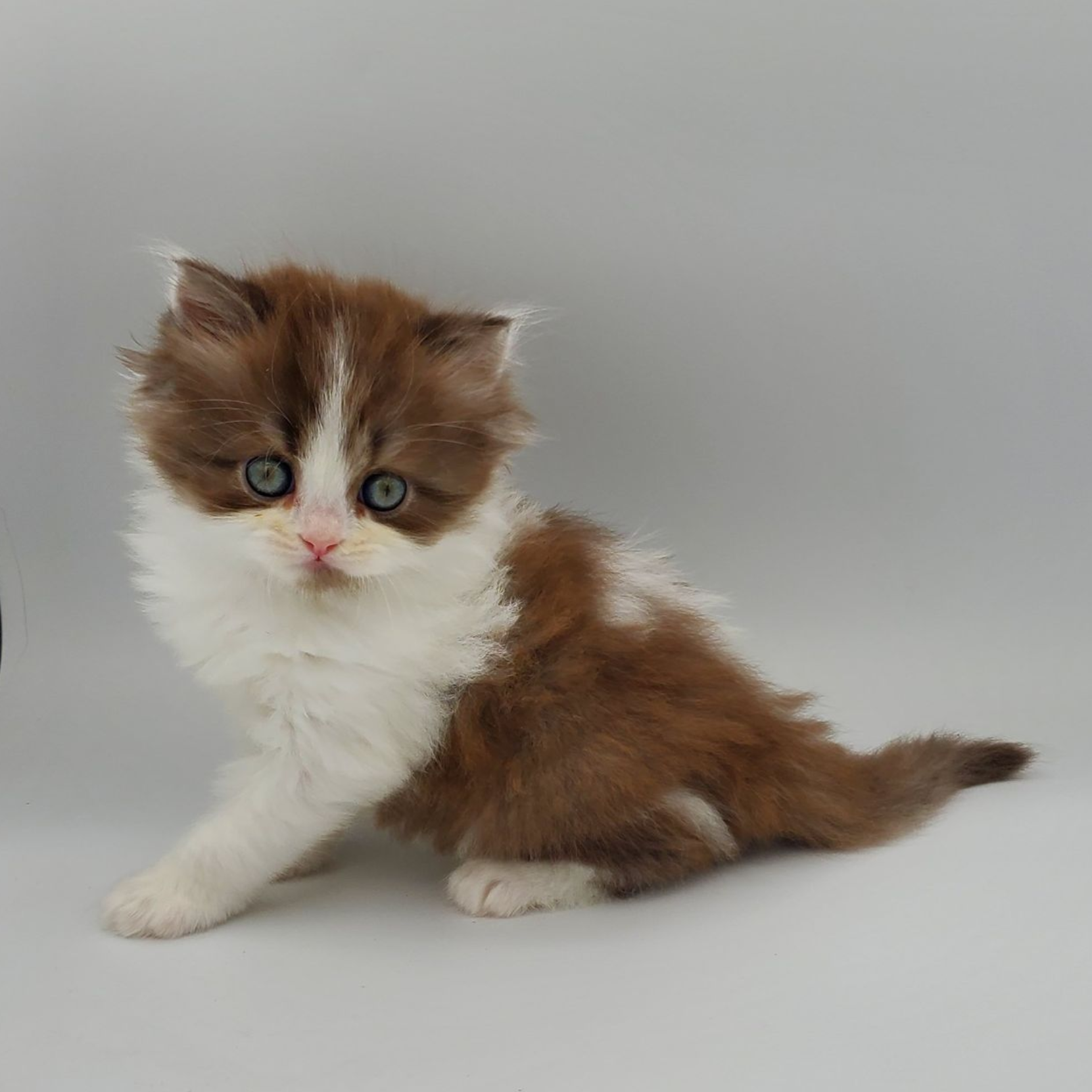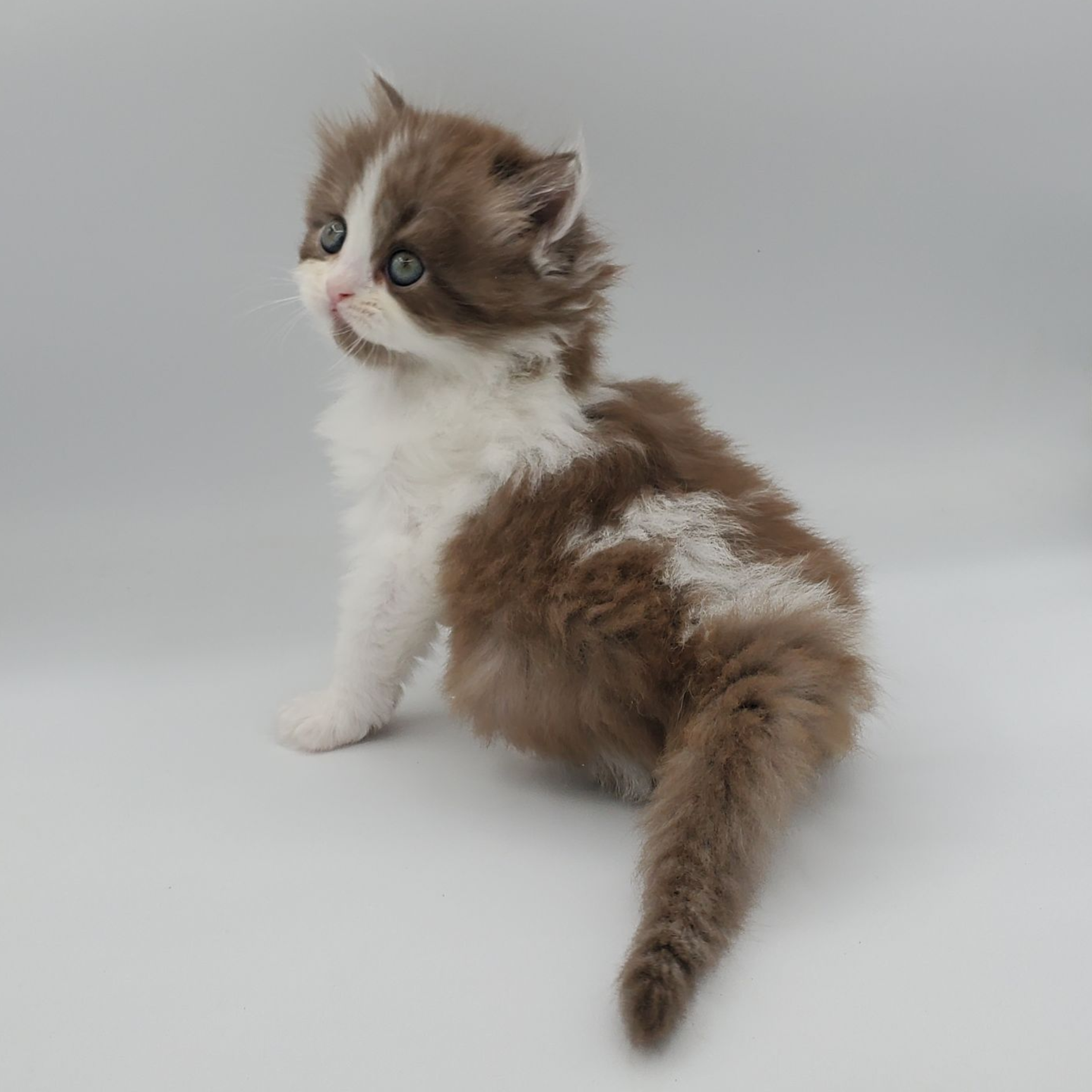 Usher is a chocolate and white Persian (non-munchkin) male from Fancy and Brimley's September 2025 Litter. He's the only boy in the litter so he's had his paws full managing all of his litter sisters! He is adventurous and playful, the first to try something new, yet is always up for a good snuggle when playtime is over.