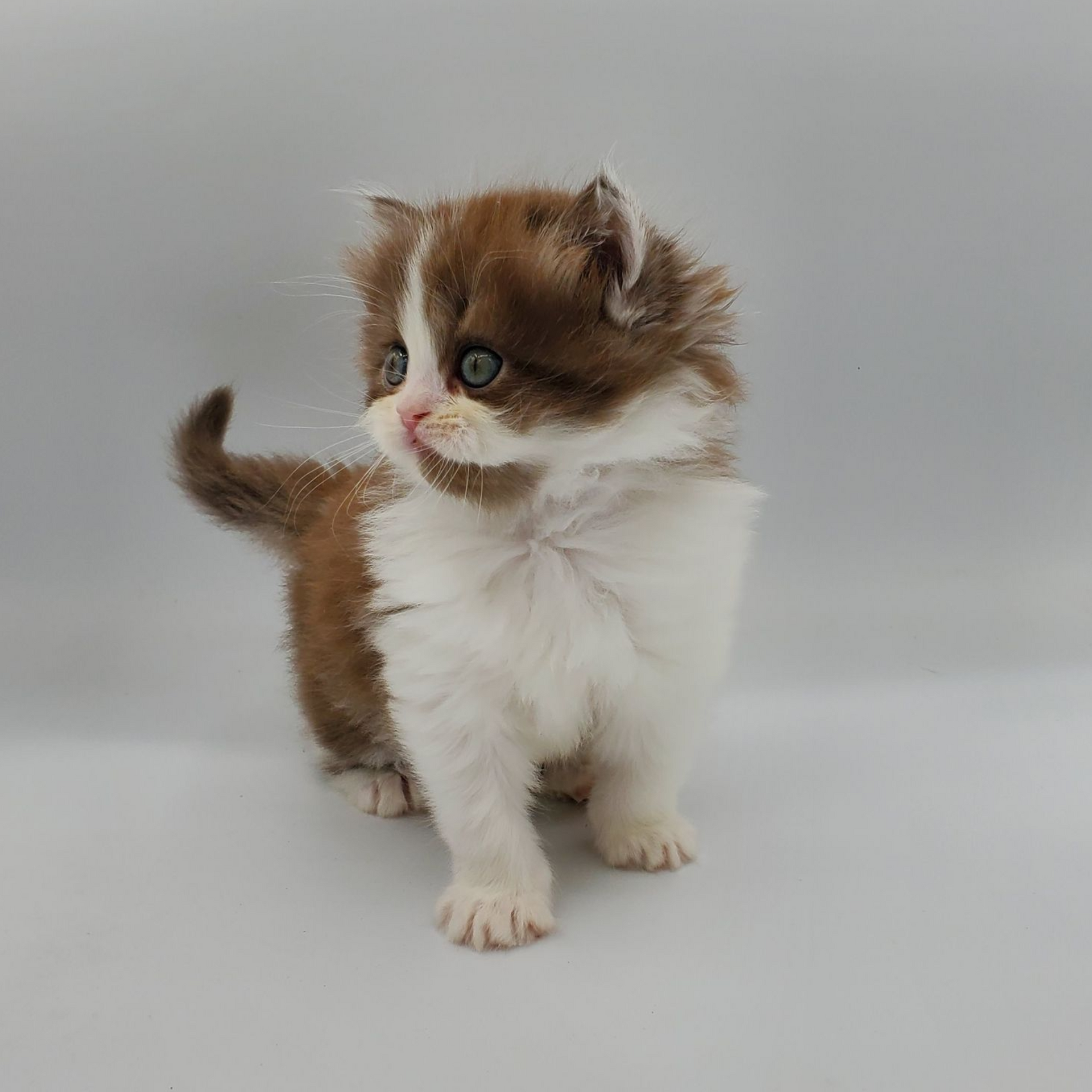 Unity is named for the beautiful paring of chocolate and white in her coat. She is the runt of the litter, but that doesn't stop her from romping and playing with her siblings. She is a chocolate and white Minuet (Persian Munchkin) female from Fancy and Brimley's September 2025 Litter. Like her siblings she is sweet and snuggly, with the tiniest little meow.