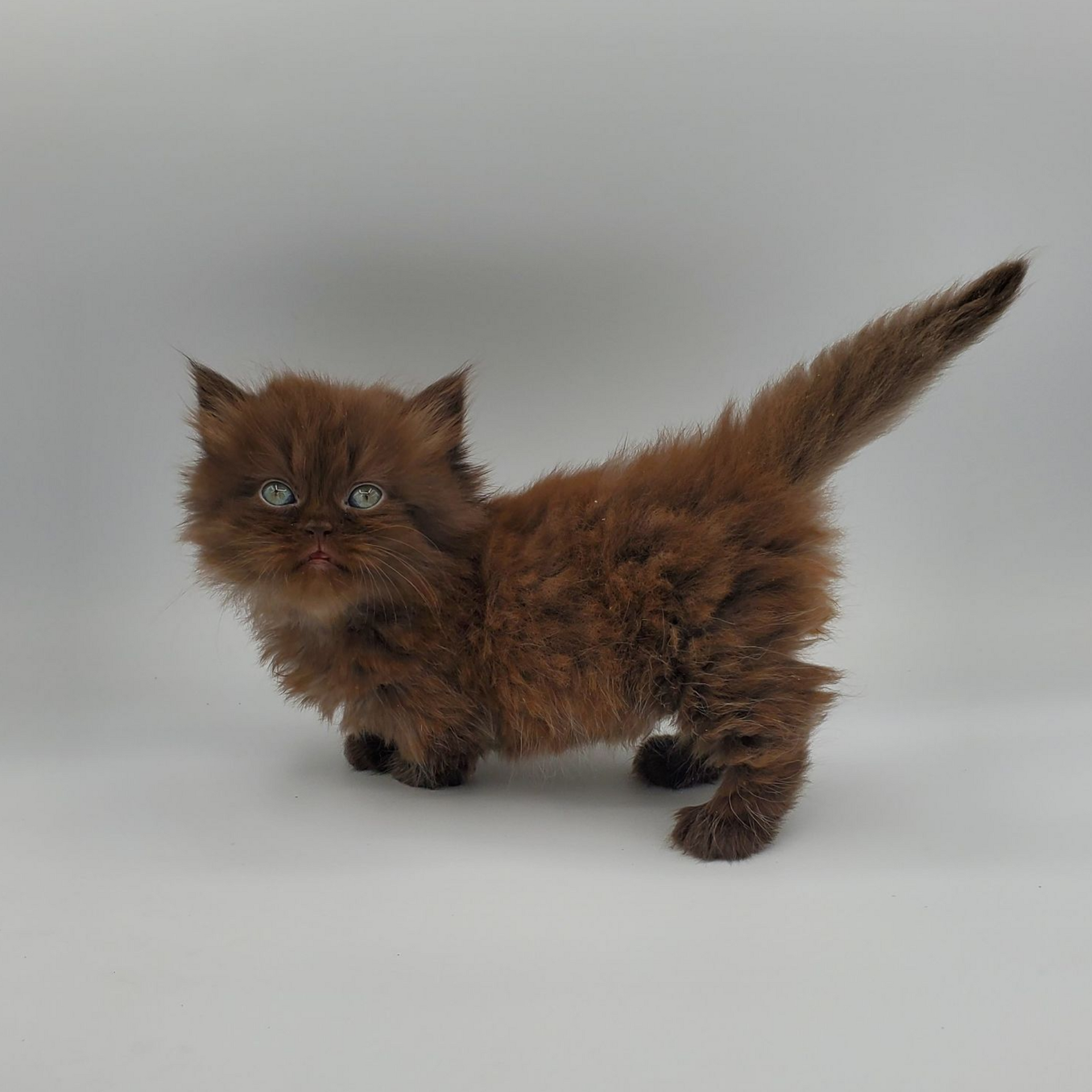 Ursa Minor looks just like her name describes, a small bear! She is a chocolate Minuet (Persian Munchkin) female from Fancy and Brimley's September 2025 Litter. She is sweet and snuggly and absolutely gorgeous. Never seen a chocolate Persian before? That is because the color is rare - she'll not only stand out because she is adorable, but also due to unique soft chocolate coat.