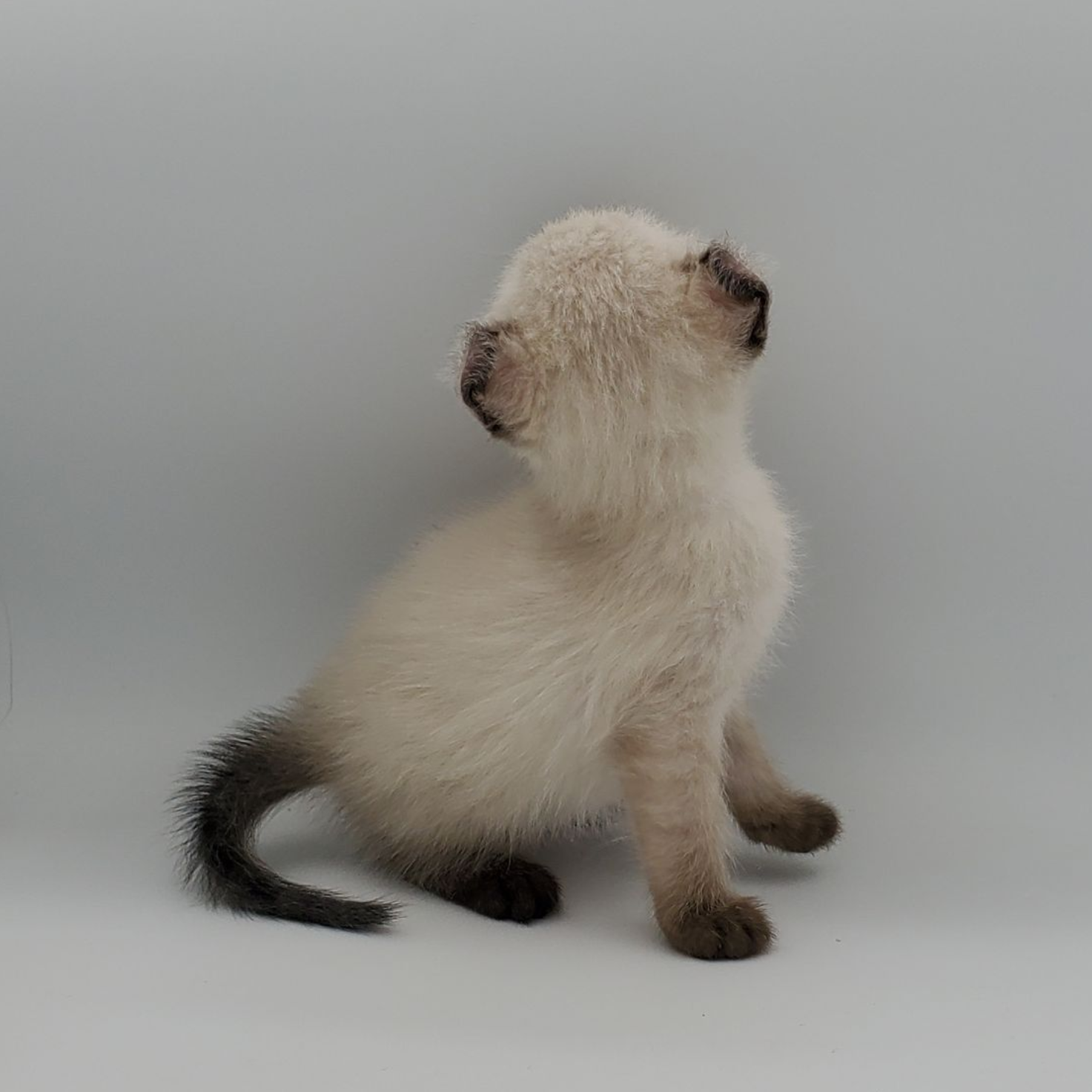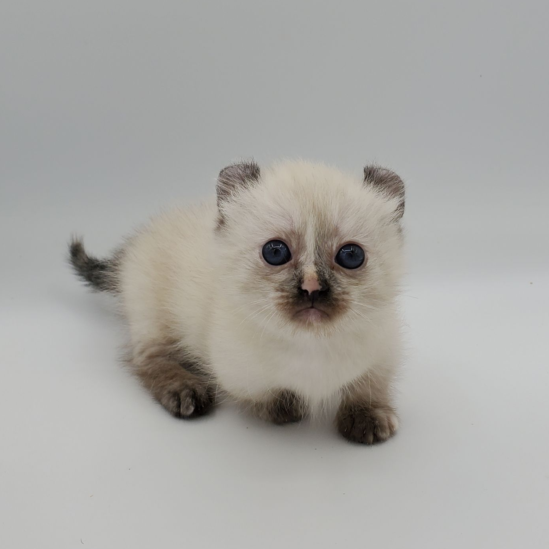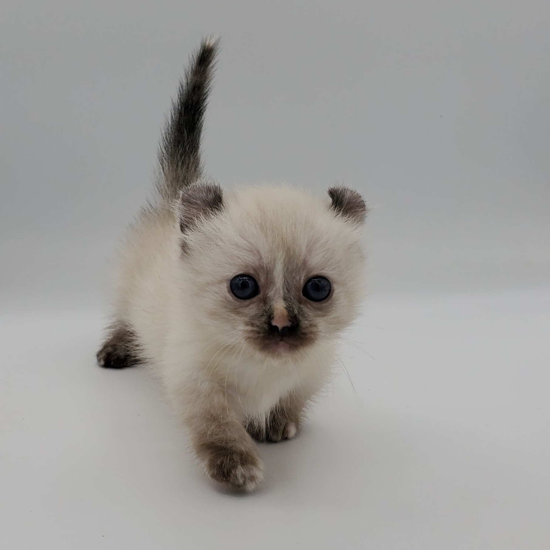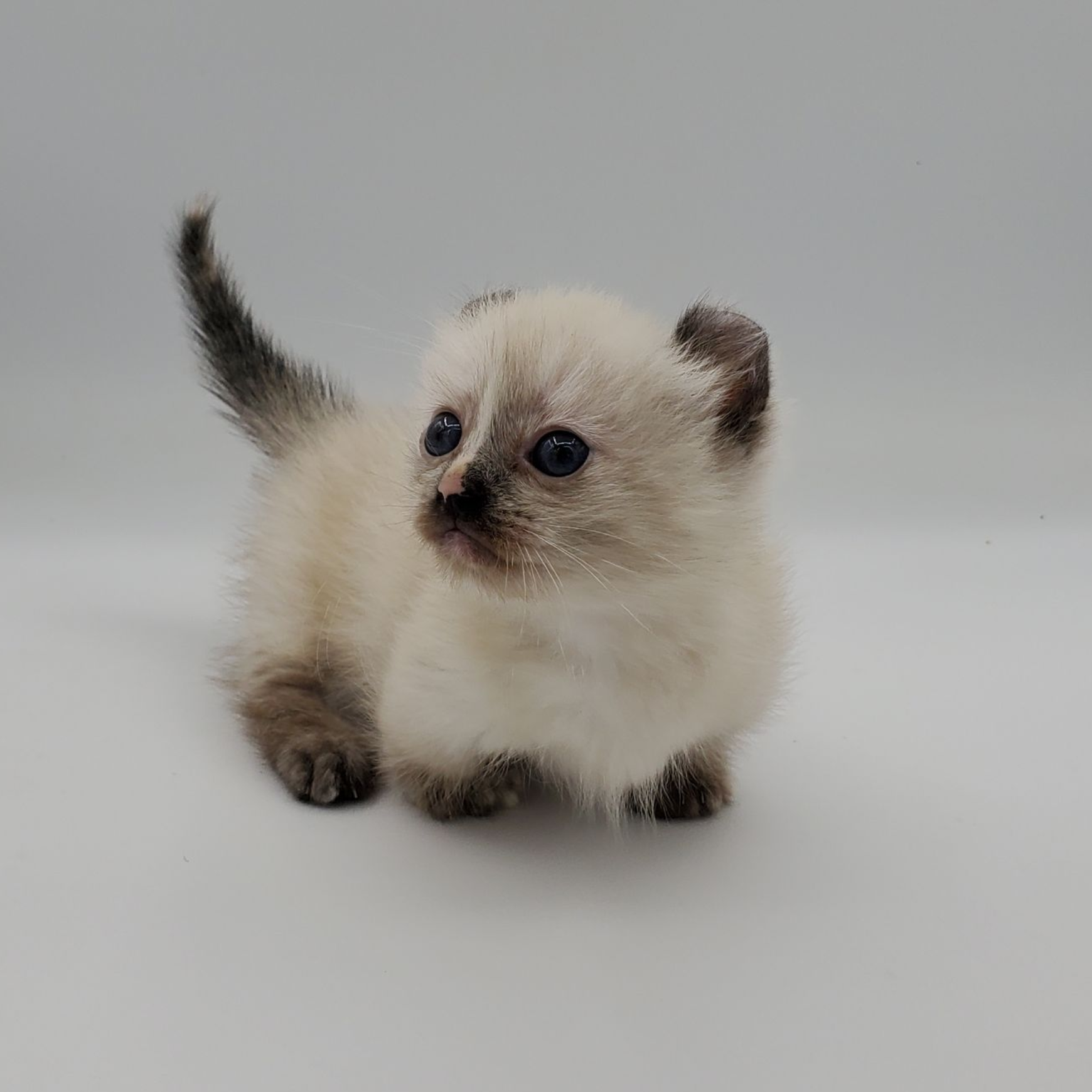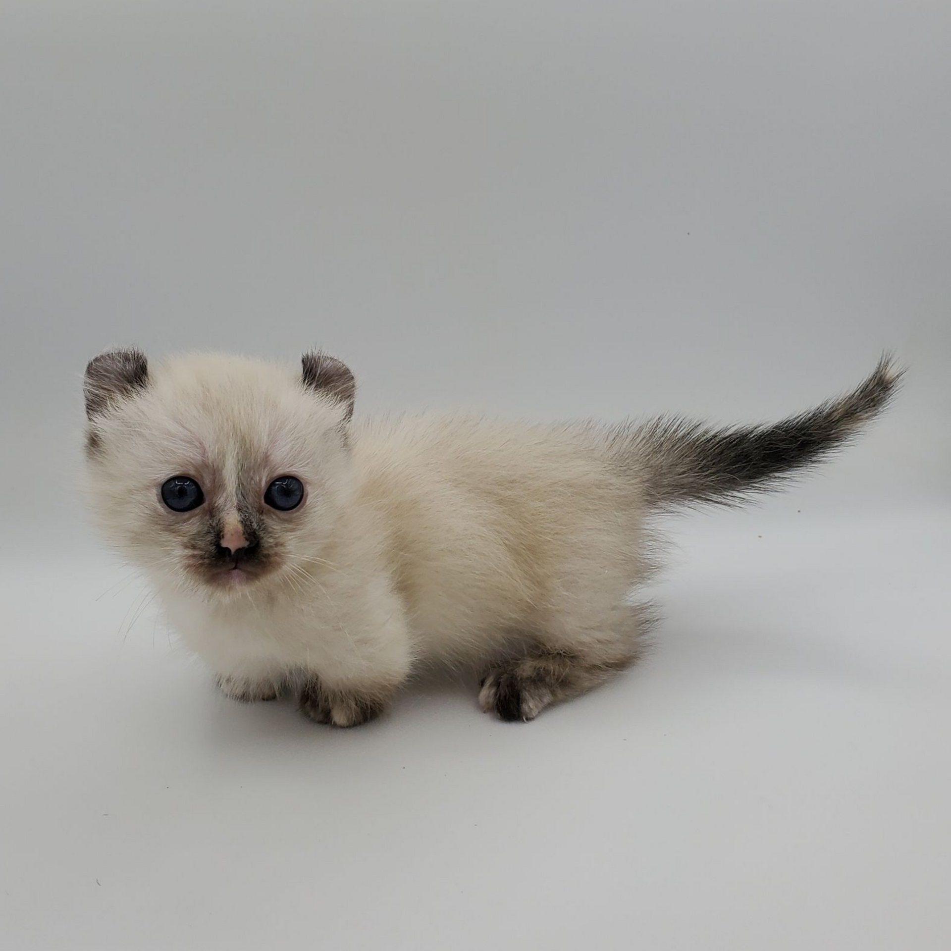 Vira is a cream-color blue-pointed Kinkalow (American Curl Munchkin) female from Shiloh and Boris's September 2025 Litter She is peppy and fun and to us looks a bit like a baby seal - do you see it too in her face??  She's got a confident demeanor and a "lets explore" attitude.  Her pointed markings are coming in dark at only 4 weeks old so she will be stunning as she matures to an adult. It is also expected that her eyes will remain blue.