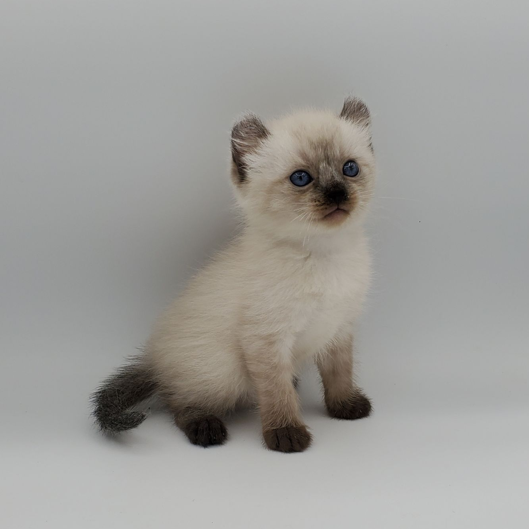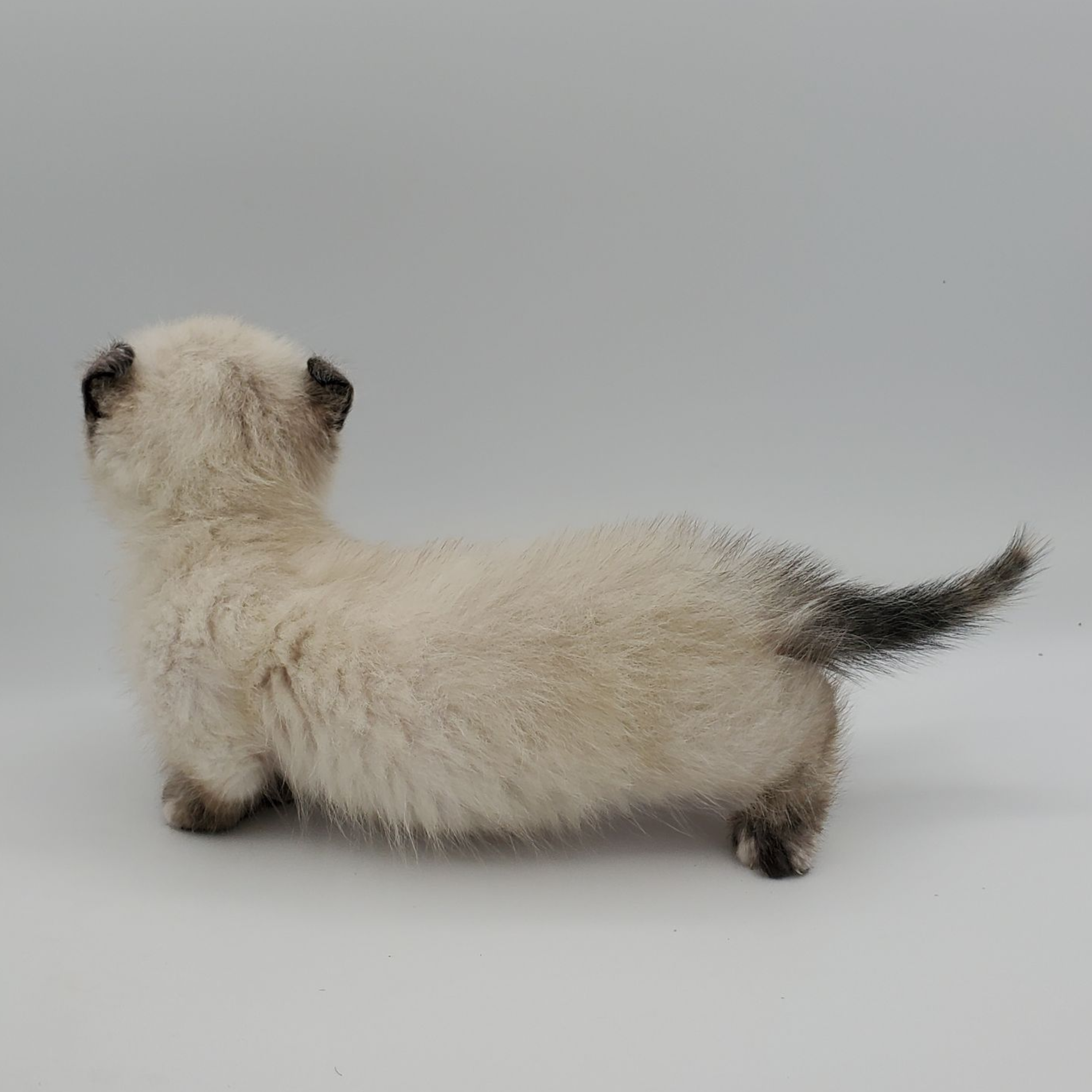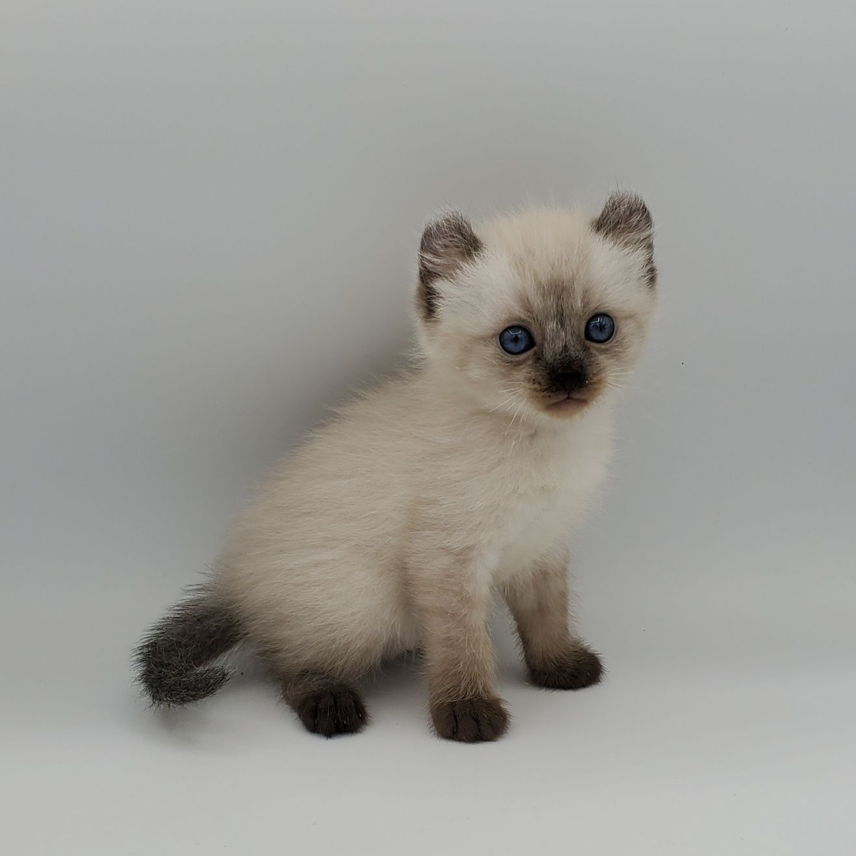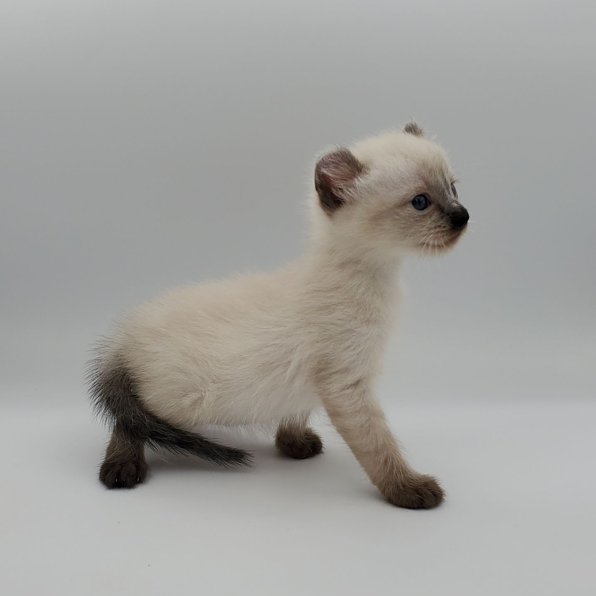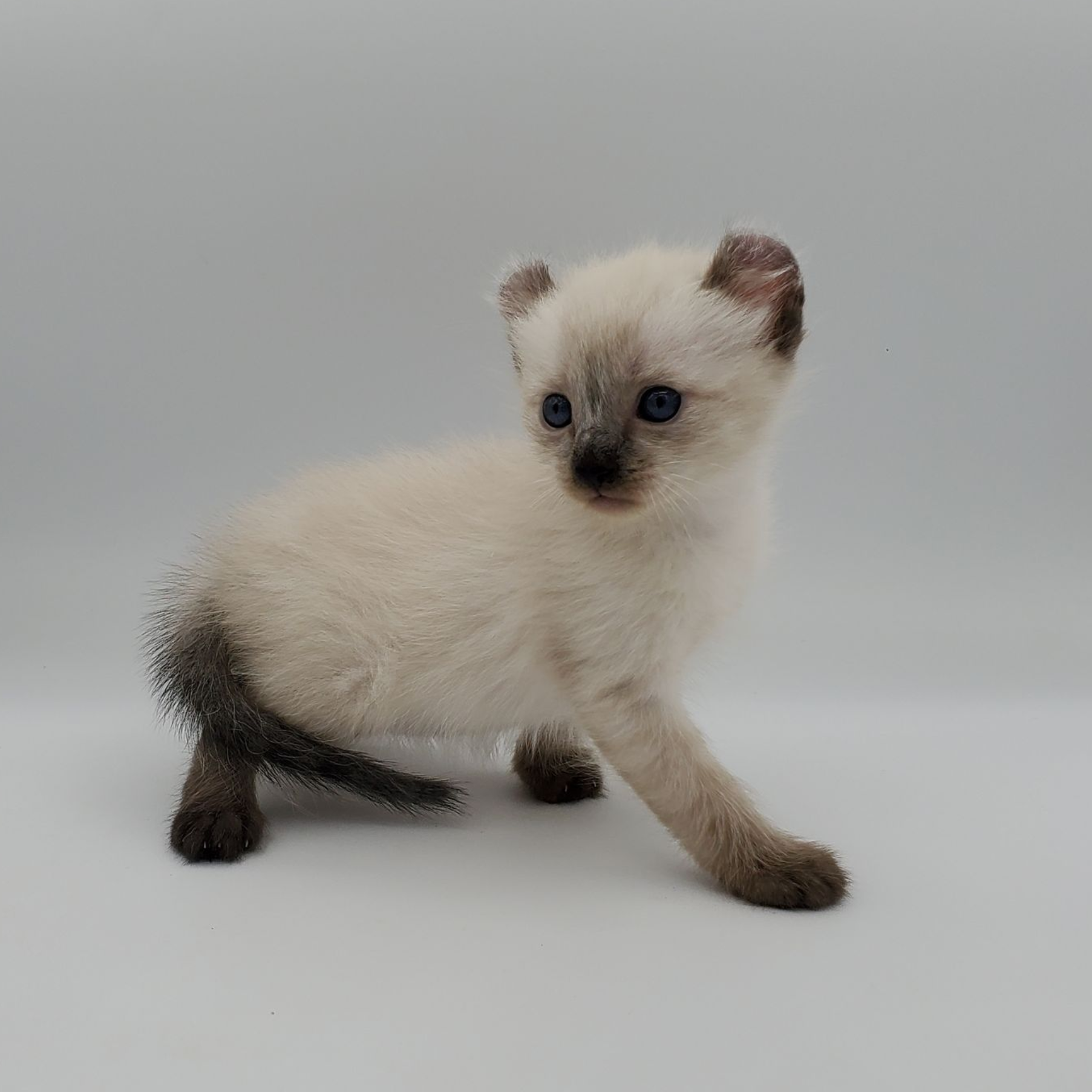 Vira is a cream-color blue-pointed Kinkalow (American Curl Munchkin) female from Shiloh and Boris's September 2025 Litter She is peppy and fun and to us looks a bit like a baby seal - do you see it too in her face??  She's got a confident demeanor and a "lets explore" attitude.  Her pointed markings are coming in dark at only 4 weeks old so she will be stunning as she matures to an adult. It is also expected that her eyes will remain blue.