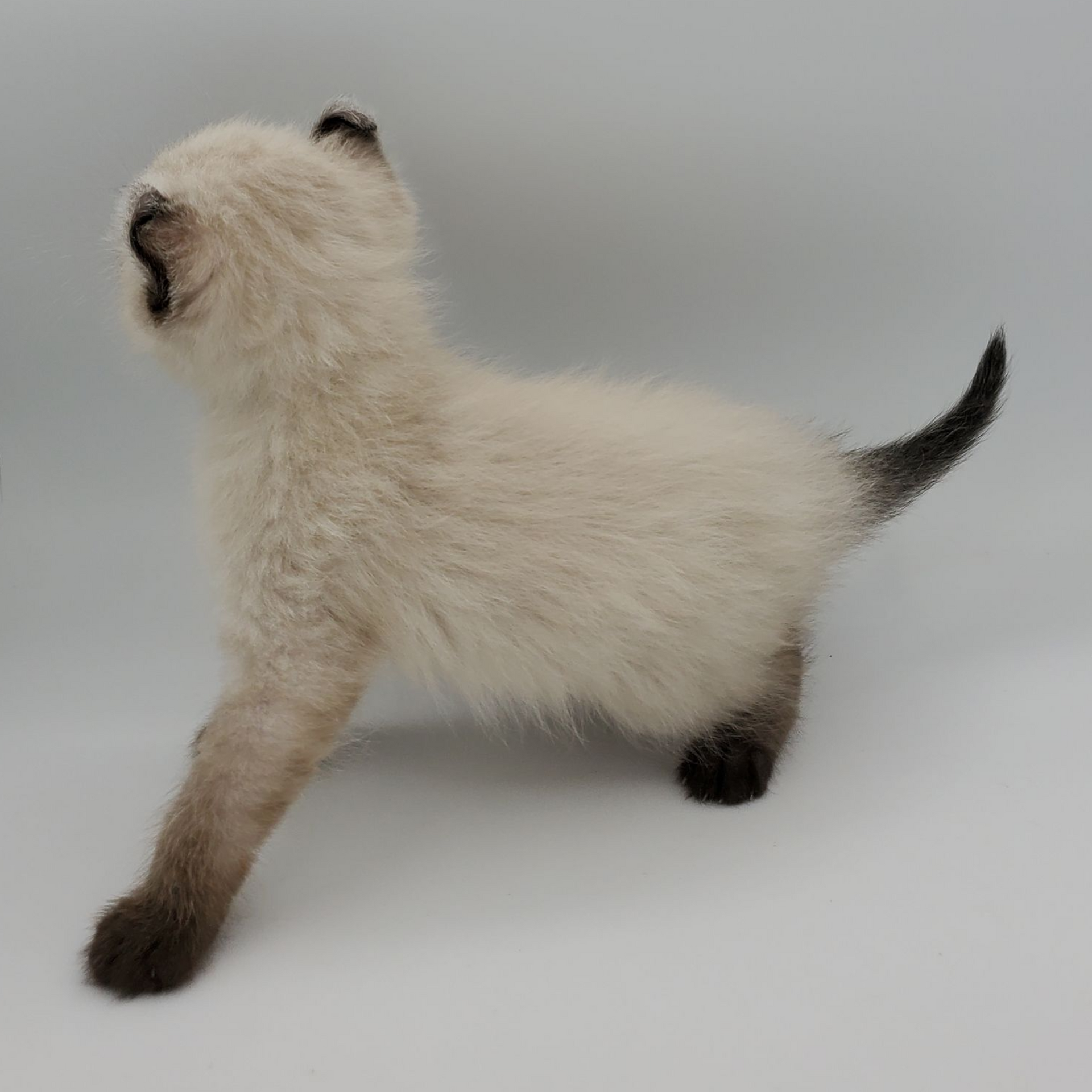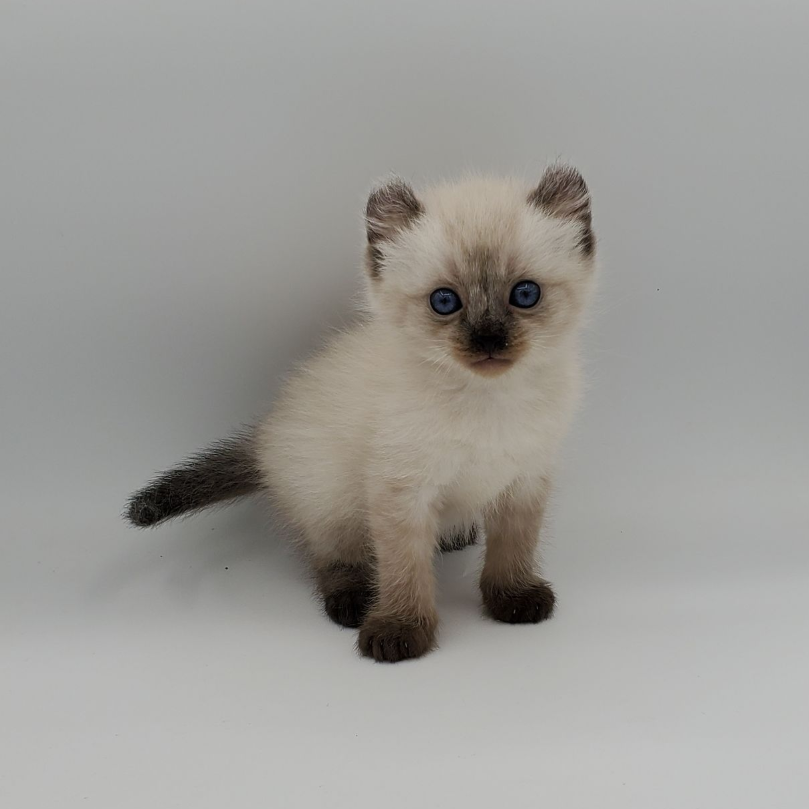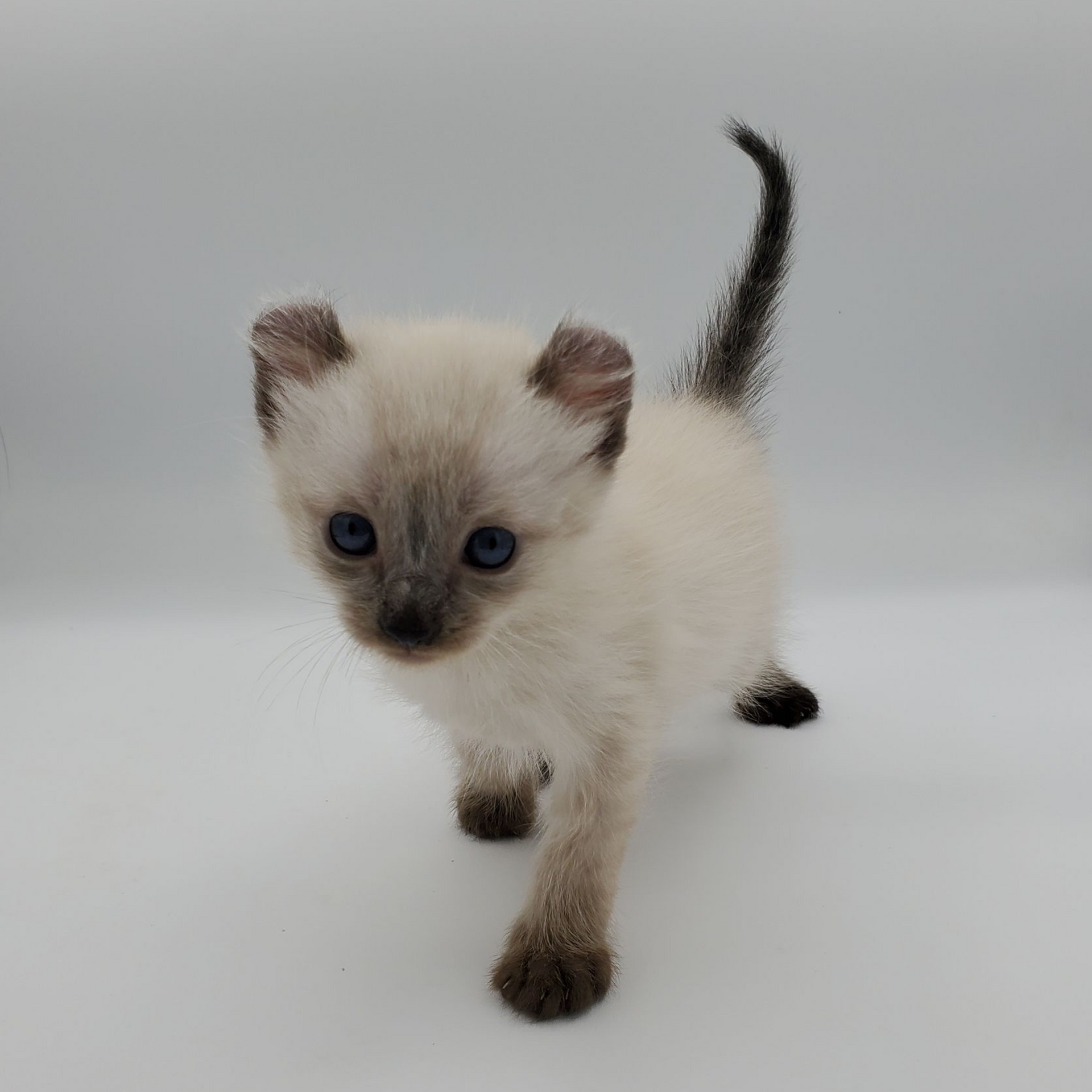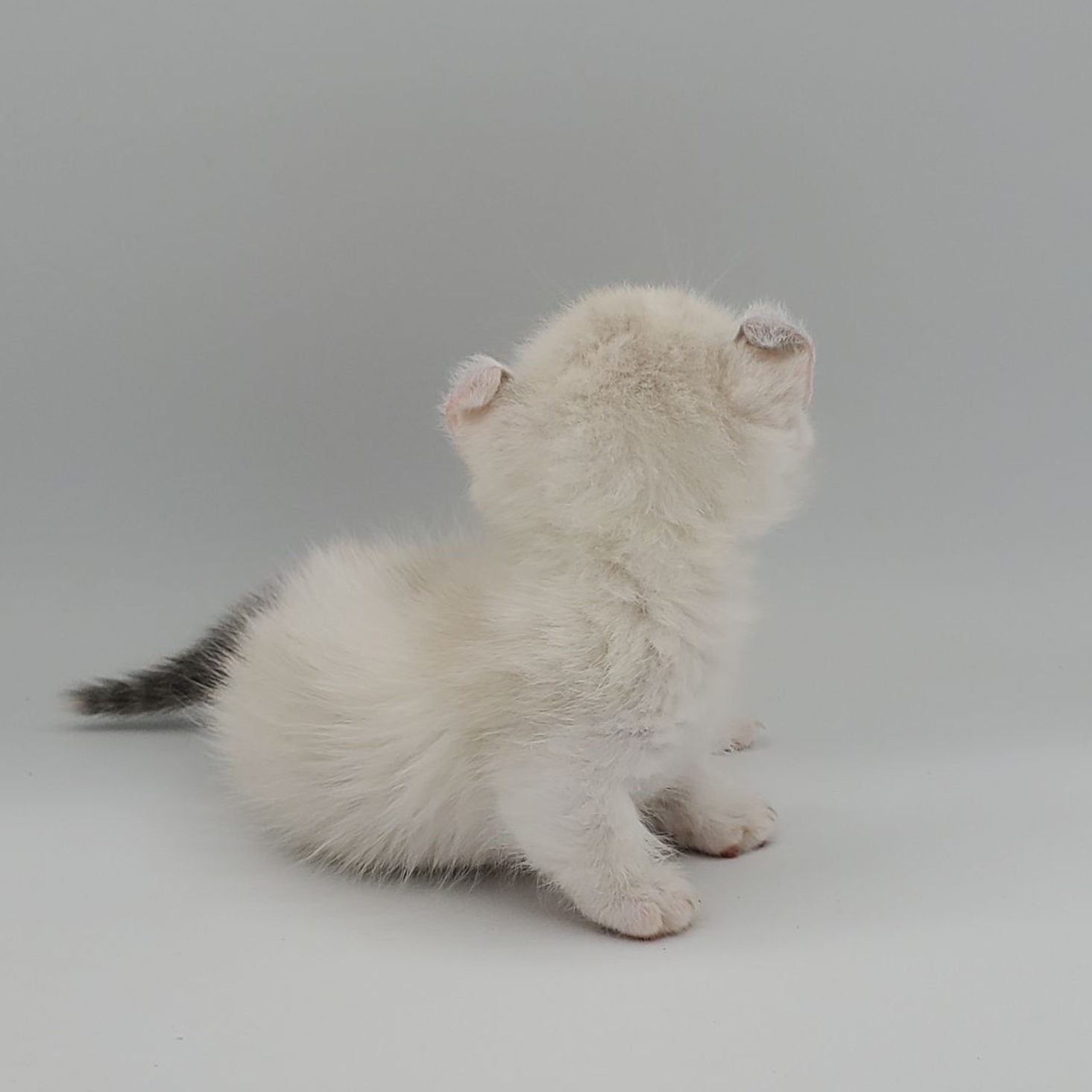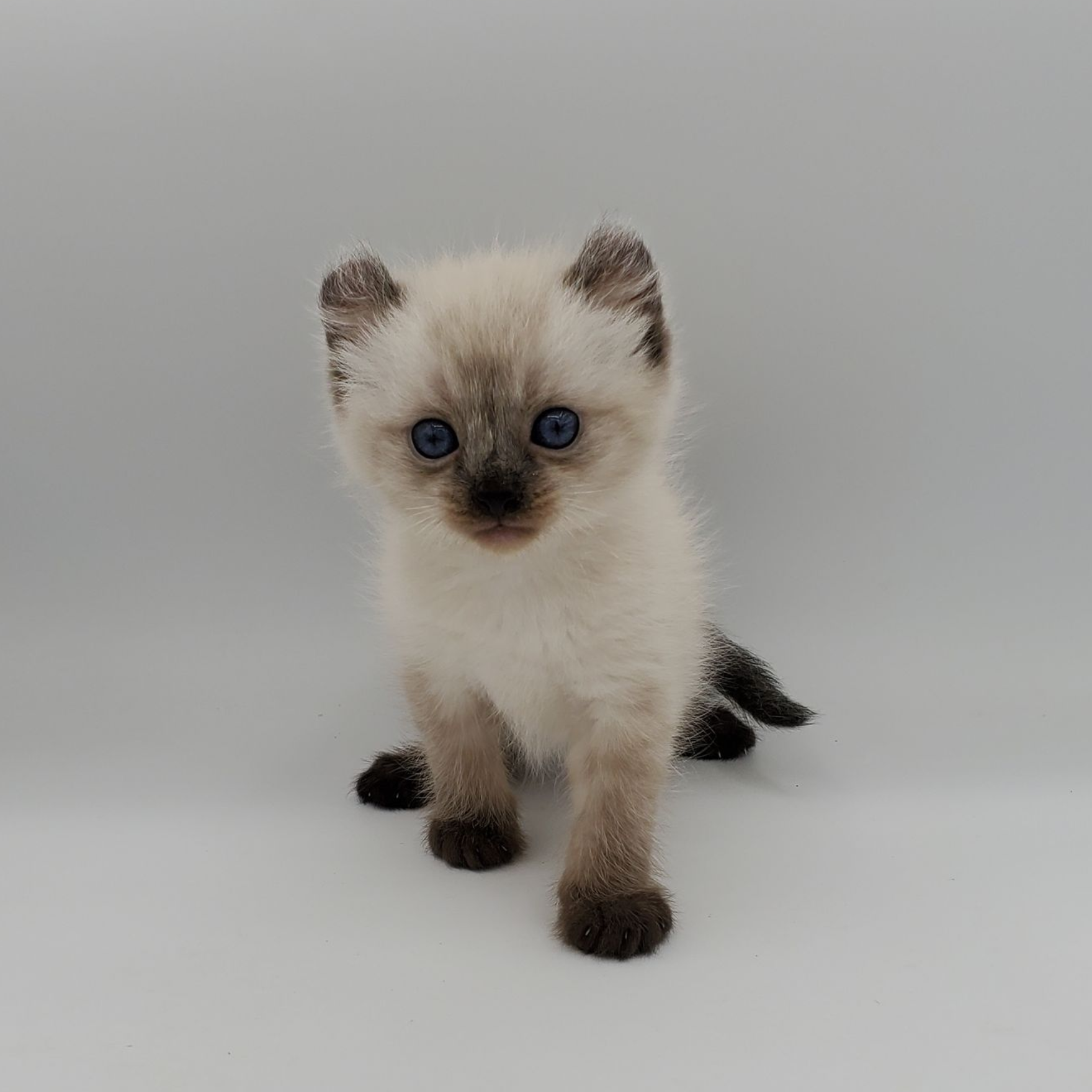 Vira is a cream-color blue-pointed Kinkalow (American Curl Munchkin) female from Shiloh and Boris's September 2025 Litter She is peppy and fun and to us looks a bit like a baby seal - do you see it too in her face??  She's got a confident demeanor and a "lets explore" attitude.  Her pointed markings are coming in dark at only 4 weeks old so she will be stunning as she matures to an adult. It is also expected that her eyes will remain blue.